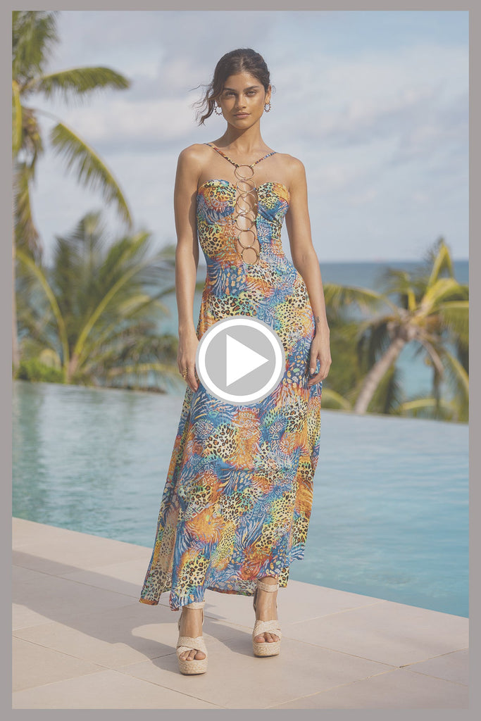 Something wild is happening and you're right there in the mix of things with this bold and beautiful Maxi Dress from the ISLA SALVAJE Collection. Animal print gets an artistic makeover and it's beautifully exotic with lots of mesmerizing visuals. A row of large rings creates a sensational plunging neckline for enhanced dramatic flair. Lace-up strings on the back make it easy to create a custom fit that flatters your figure.