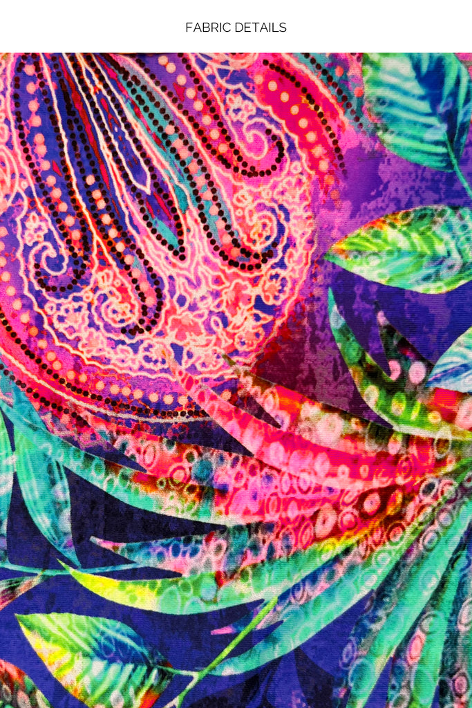 The vibe we all know and love. Jungle Fever gives you a vibe that electrifies the tropics. Neon vibrancy, reversible styles, and crystals set this wild print on fire. Perfectly paired with stylish resortwear to complete all your bold looks.
