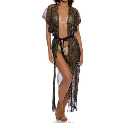 The Photo Op Queen collection of resortwear was created to perfectly complete any look or style. Sheer fabrics with shimmer details delicately lace each piece. Poncho style caftans in both long and short versions offer flirty slits on the sides and comfortable waist tie. Deep V neckline for a sexy added touch. These pieces will be the finishing touch to any getaway.
