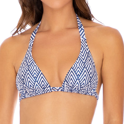 - Triangle Halter Top: Supportive, maximum coverage full cup triangle halter top with thick ties; great for D+ cups