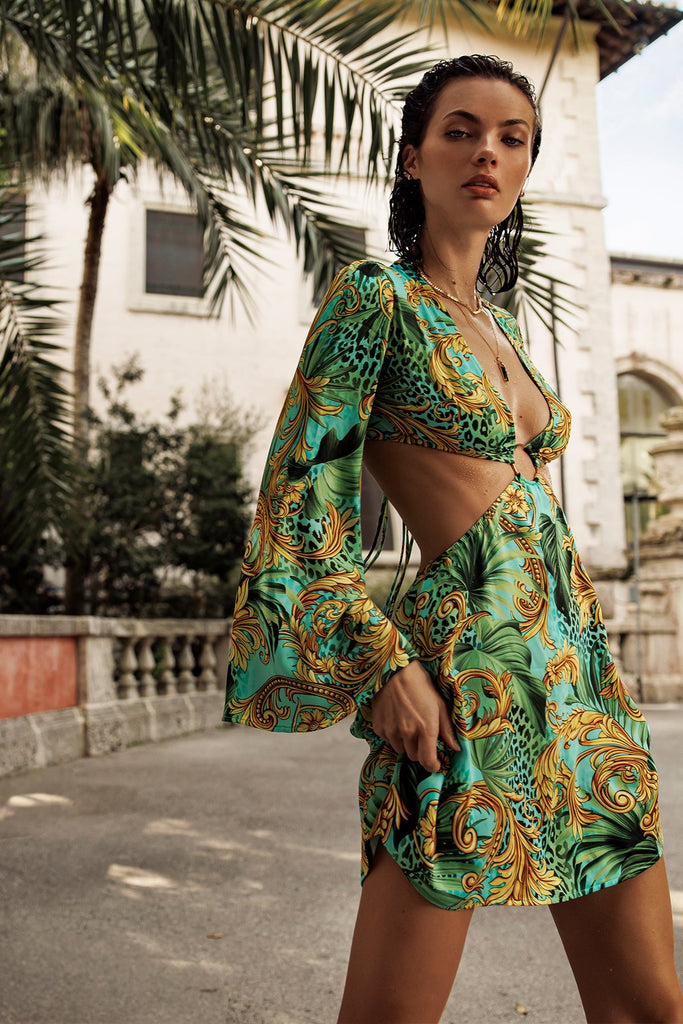 Look amazingly chic while staying cool and confident this vacation season with this multicolored short dress inspired by nature's beauty. A captivating design features lush palm leaves intertwined with gold floral flourishes and a dash of animal print for fun. Enjoy showing off your lovely skin with a plunging V-neck and large cut-out details at the sides. A single large metallic ring at the center brings the bling.