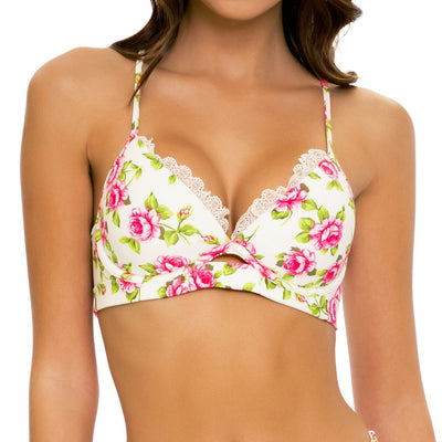 A whole new take on the string bikini, this gorgeous floral print two-piece combines a classic print motif with sexy, skinny straps on the top and bottom. The triangle top halter perfectly complements the side-tie, ruched back bottoms.