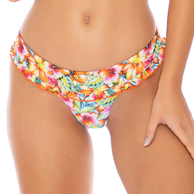 - Wild Flower Wavy Ruched-Back Tie-Side Bottom: Brazilian-coverage bikini bottoms with adjustable string ties at the sides