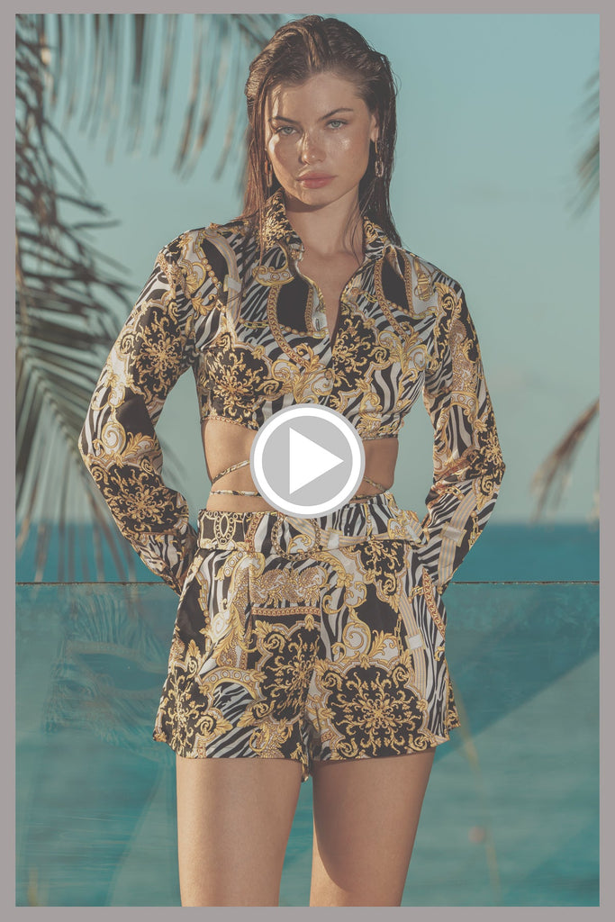 Paired with matching comfortable-fit shorts, this set is perfect for a stylish, laid-back day at the resort or an evening out. The shorts come with a wide, adjustable belt adorned with a stylish gold center ring, ensuring a flattering fit. Both pieces together create a stunning look that's elegant yet fun, perfect for Luli Babes who love to make a statement with their style.