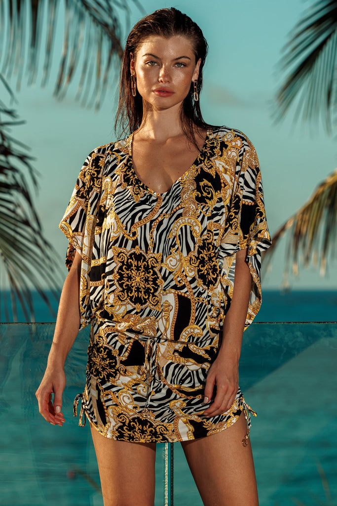 Embrace your fun-loving, bold side, Luli Babes, with the GODDESS VIBES South Beach Dress-an outfit that creates a rich, couture look for sun-filled days the easy way. This dress gives the classic South Beach style a bold makeover where exotic meets elegance, with a striking zebra animal print adorned with gold floral flourishes.