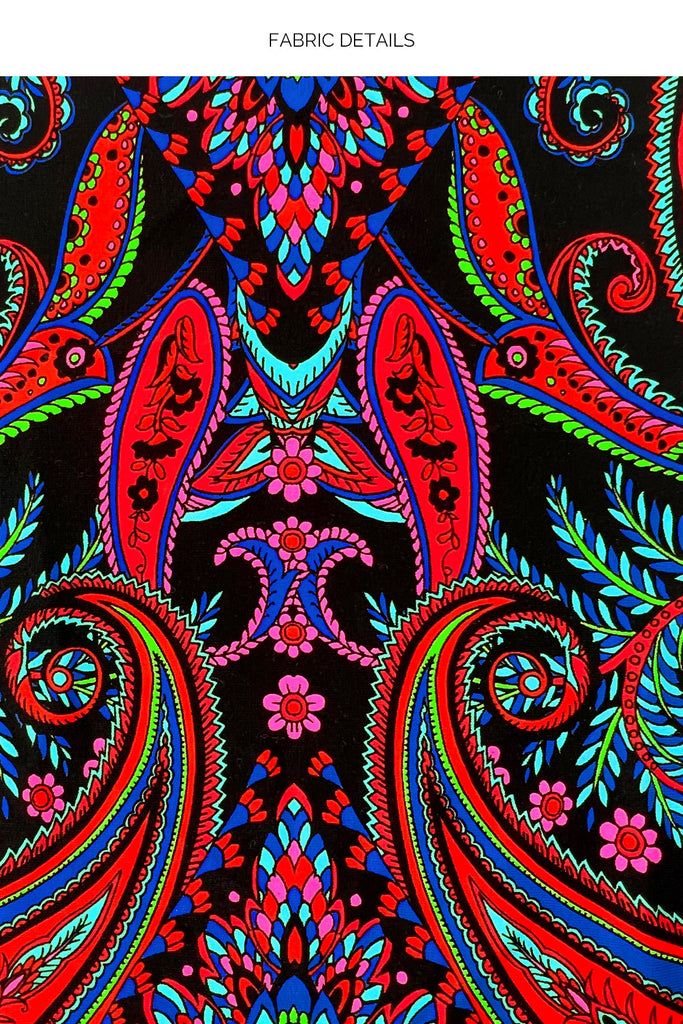 Do you love boho prints? This QUE LINDA bikini is sure to capture your eye, and become a timeless favorite because of its striking paisley print. Far from a standard paisley, this bikini features a print that gets its inspiration from the plants that thrive in and around the beautiful ocean waters near tropical islands. The medley of paisley with tropical colors is also unique, and a black background makes the print pop with magnetic energy.