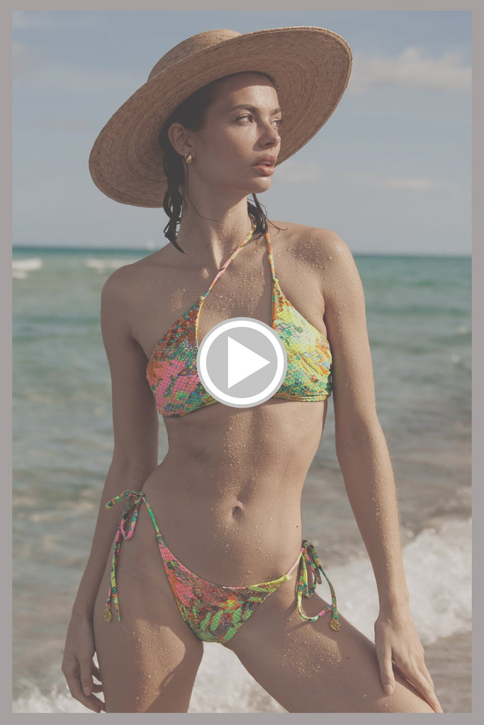 Luli Babes, things are getting a little hot around here. We're talking about this sexy bikini with a versatile, multi-way style. You get to enjoy two looks with the same bikini, and the first awesome option is the vibrant multicolored print that showcases your creative vibe and cheekiness with a revealing keyhole top and strappy backside. Whenever you desire, you can wear the top three unique ways. And when you want more versatility, you can reverse the top and bottom pieces and enjoy wearing a bright yellow bikini look.