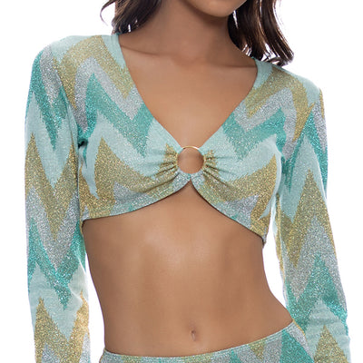 The long-sleeve top has a sultry plunging neckline and a playful peek-a-boo center ring detail, which adds a flirty twist to the overall design. It's the perfect balance of fun and sophistication, while the long sleeves add a chic vibe, making it ideal for both day and night outings.