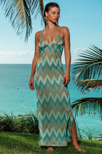 Make a queenly statement with this on-trend pants set designed to keep you looking effortlessly chic from brunch to evening activities. The mesmerizing multicolored green chevron pattern and glittering metallic fabric create an exciting and bold look, perfect for those who love a little extra glam.