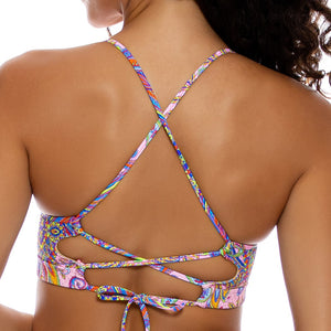 - For Our Stand Out Luli Babes! - This Top Has Great Underwire Support And Thick Breast Line Band For Comfort - Sexy Center Cut Out Detail - Sporty Corset Style Back Offers An Adjustable Fit - String Ties Completed With Our Classic Luli Rings - Textured Luxe Fabrics Illuminate This Prints Bold Color Shades - Print Is Not Exact And May Vary According To Cut - 83% Polyamide 3% Lurex 14% Spandex
