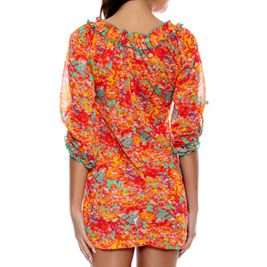 -3½ sleeve mini dress -Ruffle detail at neck and sleeves -Adjustable tie at neck and sleeves -Prints Are Not Exact And May Vary According To Cut
