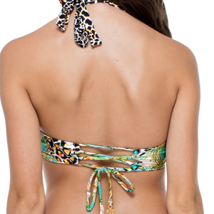 -This push up top is the ultimate fit -Underwire support gives extra lift and comfort -Thicker neck straps for comfort -Lace up back for a custom adjustable fit -Plunging neck line -Print is not exact and may vary according to cut -80% Nylon 20% Spandex