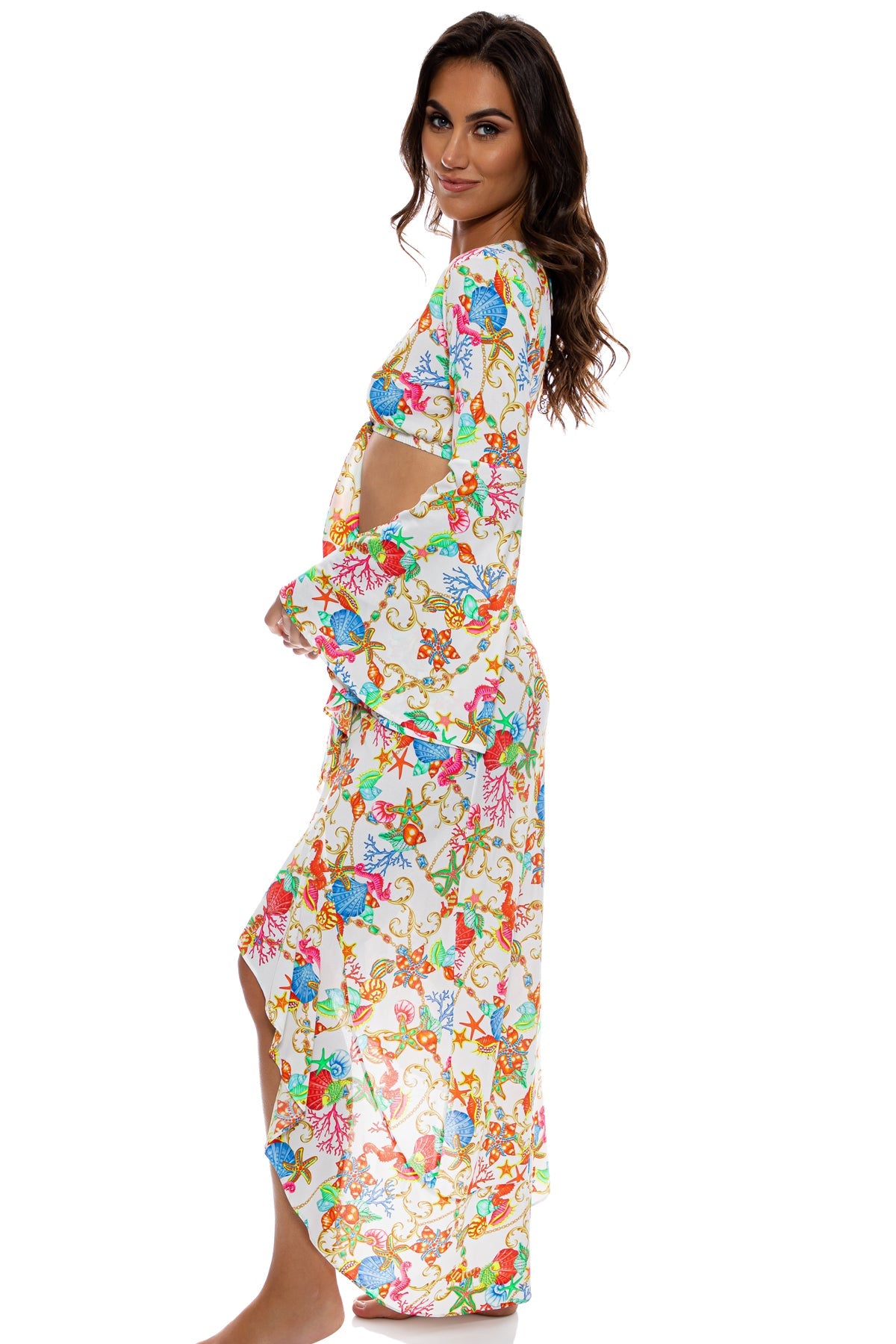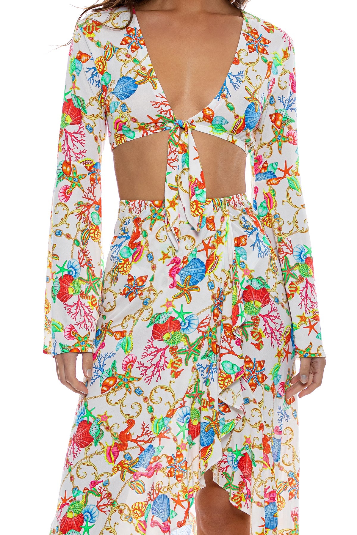 IL MARE - Bell Sleeve Crop Top & Ruffle High Lo Slit Skirt • White – Luli Fama