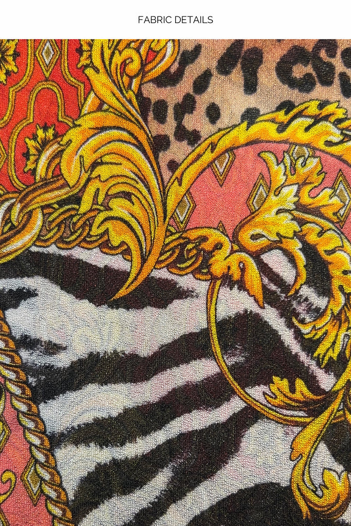 Tropical Majesty is wild glamour redefined—where zebra stripes and leopard spots meet fiery orange tones and sunlit gold. Luxe chain embellishments elevate each piece into a statement of bold elegance, perfect for the queen of every getaway.