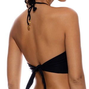 - A Bralette Style Top - Knot Center Design - Deep Plunging Neckline - Thin Neck Tie For An Adjustable Fit - Thicker Back Tie For A Supportive Hold - Reversible To Our Classic Gold Rush Style - 80% Nylon 20% Spandex