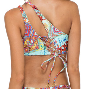 -One shoulder bandeau style top -Edgy cut out deign on strap -Lace up back offers an adjustable comfortable tight fit -Reversible to a secondary print giving you more mix and match options! -Prints are not exact and may vary according to cut -Fabric is 80% Nylon 20% Spandex